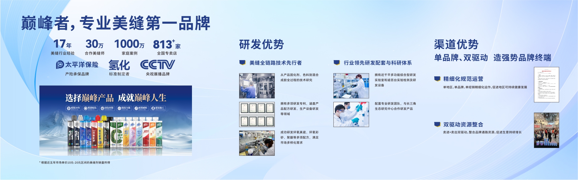 巅峰者美缝(浙江巅峰新材料有限公司)隶属浙江巅峰实业有限公司旗下品牌,是一家集研发、制造、销售于一体的专业美缝剂品牌,深耕美缝领域十余载,以掌握美缝核心技术为核心优势,致力打造中国专业美缝第一品牌,主营美缝剂、美容胶等全屋缝隙系统美化产品,为千万家庭提供高品质的缝隙美化解决方案。1、巅峰实力:巅峰者依托母公司浙江巅峰集团2009年起积淀的环氧树脂原材料研究与应用经验,从树脂饰品辅料领域起步,逐步深耕美缝原料应用与产品研发,成立美缝建材独立事业部,完成美缝品牌专业化、规模化布局。历经多年发展,巅峰者美缝品牌已成为国家高新技术企业、美缝行业高质量发展标杆企业,斩获CCTV中国优选品牌、美缝行业最具...