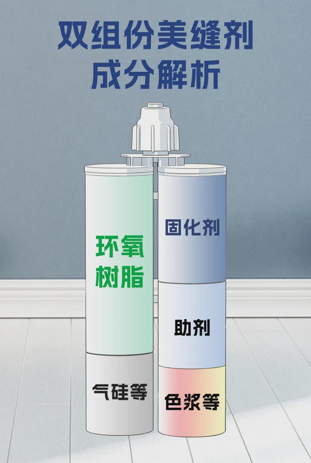 市面上常见的双管美缝剂,通常由固化剂、环氧树脂、填料、色粉及多种助剂等构成一瓶完整的美缝剂。