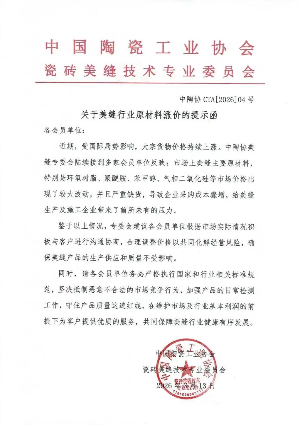 近期,中国陶瓷工业协会瓷砖美缝技术专业委员会发布的一份提示函在业内引发广泛关注。文件指出,受国际局势影响,环氧树脂、聚醚胺、苯甲醇等美缝主要原材料价格大幅上涨且严重缺货,企业采购成本骤增,美缝行业正面临前所未有的压力。